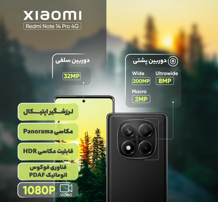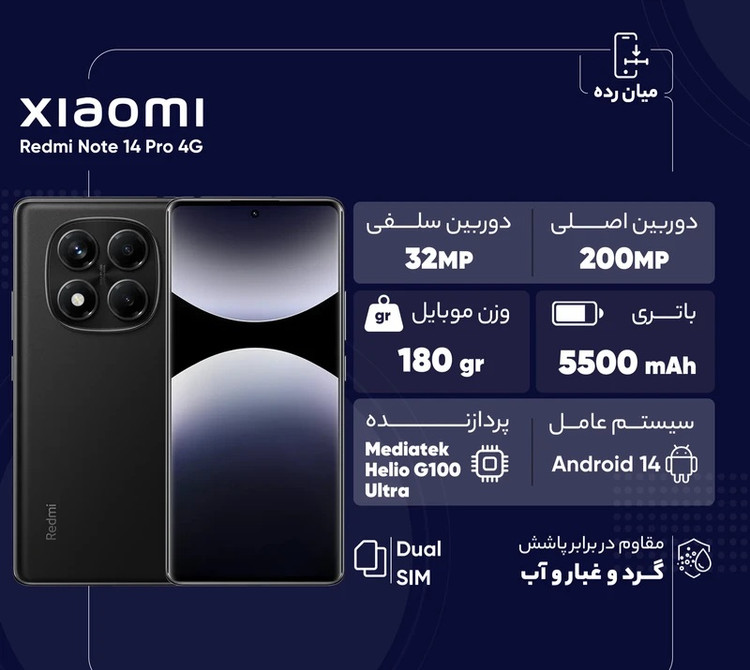گوشی Redmi Note 14 Pro 4G یکی از جدیدترین گوشیهای سری Note شیائومی است که با تمرکز بر طراحی جذاب، عملکرد قدرتمند و نمایشگر بینظیر عرضه شده است. این دستگاه با بدنهای از ترکیب شیشه و پلاستیک و مقاومت در برابر پاشش آب و گردوغبار طراحی شده است که ترکیبی از دوام و زیبایی را ارائه میدهد. نمایشگر 6.67 اینچی AMOLED با وضوح 1080 در 2400 پیکسل و نرخ تازهسازی 120 هرتز، تجربه بصری فوقالعادهای را فراهم میکند. پشتیبانی از فناوری HDR10+، و روشنایی 1800 نیت، کیفیت تصویر را به سطحی حرفهای میرساند. محافظت نمایشگر توسط Gorilla Glass Victus 2 نیز مقاومت در برابر خط و خش و ضربه را تضمین میکند. در بخش پردازنده، تراشه Helio G100 Ultra با معماری 6 نانومتری ساخت شرکت مدیاتک و پردازنده گرافیکی Mali-G57 MC2، قدرت کافی برای اجرای بازیها و برنامههای نیمه سنگین را فراهم میکند. دوربین اصلی 200 مگاپیکسلی، دوربین فوق عریض 8 مگاپیکسلی و دوربین ماکرو 2 مگاپیکسلی مجموعه دوربینهای این گوشی را تشکیل میدهند. همچنین دوربین اصلی این گوشی امکان ضبط ویدیو 1080p با سرعت 30 و 60 فریم بر ثانیه را دارد. دوربین سلفی 32 مگاپیکسلی نیز برای عکاسی پرتره و تماسهای تصویری ایدهآل است. باتری 5500 میلیآمپرساعتی با شارژ سریع 45 واتی، استفاده طولانیمدت و شارژ سریع را تضمین میکند. Redmi Note 14 Pro 5G با امکاناتی همچون اسپیکرهای استریو و رابط کاربری HyperOS بر پایه Android 14، یکی از بهترین گزینهها در میان گوشیهای میانرده محسوب میشود.